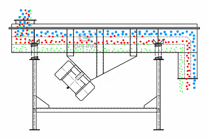 當(dāng)葵花籽經(jīng)由直線振動篩入料口進入直線振動篩篩面上時,直線振動篩利用其雙臺電機的激振力及葵花籽自身的重力作用,使得葵花籽在篩面上被拋起并向前運動,小于篩面孔徑的葵花籽落入篩面下層,大于篩面孔徑的葵花籽在跳動,不同規(guī)格的葵花籽分別從各自的出口排出,以此完成整個篩分除雜過程。
