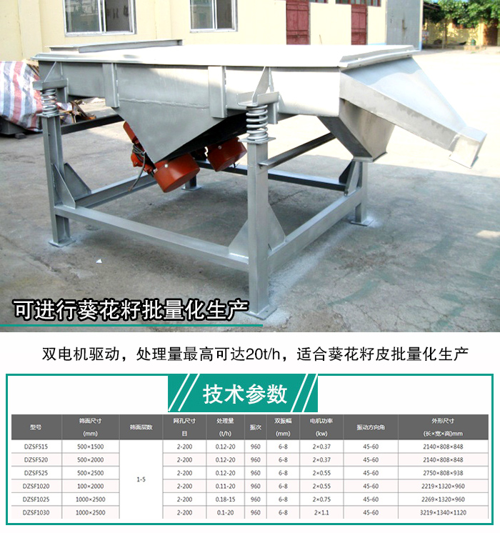 如果您對于葵花籽有多種粒度要求,新鄉(xiāng)大漢直線振動篩篩面可有1~5層不同設(shè)計,可以同時分選2~6種不同粒度規(guī)格的葵花籽,篩分效率高,而且直線振動篩采用雙電機驅(qū)動,處理量高可達20t/h,適合葵花籽皮批量化生產(chǎn)。