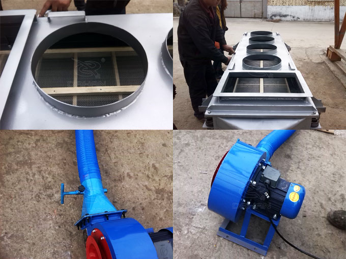 長方形振動篩)是以“大漢牌”DZSF系列直線振動篩為基礎(chǔ),在進料口底部或箱體下側(cè)端增加了風(fēng)機降溫冷卻系統(tǒng),在進料口加裝篩網(wǎng)及小型排料口使大顆粒結(jié)塊物料從小型排料口中排出,該裝置可有效攔截大顆粒并緩沖物料對篩網(wǎng)的沖擊,延長篩網(wǎng)使用壽命(該裝置針對部分物料,不需要可去除)。物料在進入設(shè)備時,位于進料口底部或箱體下側(cè)端的風(fēng)機降溫冷卻系統(tǒng)對其進行降溫作業(yè),兩臺