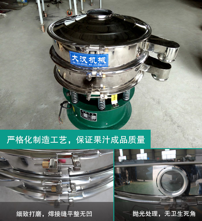 整機精選304不銹鋼材質(zhì),篩機全部進行拋光處理,無衛(wèi)生死角,篩框的焊接處要求進行打磨,焊接縫平整無凹點,完全符合果汁行業(yè)對于衛(wèi)生的要求及標(biāo)準(zhǔn)。